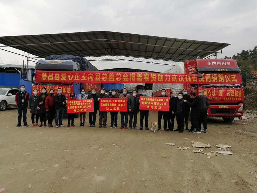 2020年3月6日,福建省順昌縣愛心企業(yè)向縣慈善總會(huì)定向捐贈(zèng)的第二批物資助力武漢捐贈(zèng)儀式在順昌縣綠通物流舉行。由臺(tái)盟福建省委會(huì)、福建省順昌合億農(nóng)產(chǎn)品開發(fā)有限公司捐贈(zèng)的綠仙椒罐頭10噸(3千件)、福建順昌茂盛食品有限公司捐贈(zèng)的清水罐頭20噸、福建省順昌縣工廠化食用菌同業(yè)協(xié)會(huì)捐贈(zèng)的海鮮菇18800斤等物資帶著順昌人民與武漢人民共克時(shí)艱、共抗疫情的深情厚意無償馳援武漢。