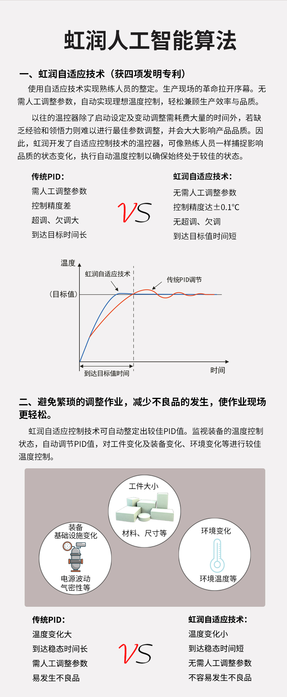 虹潤公司是專業(yè)生產(chǎn)無紙記錄儀的國家專精特新“小巨人”企業(yè)。生產(chǎn)的觸摸屏溫控器,具有觸摸大屏顯示,真正人工智能算式,無需人工整定參數(shù),控制精度達(dá)士0.1°C, RS485/以太網(wǎng)通訊,5/7/9英寸可選等特點(diǎn)。產(chǎn)品獲得智能化控制器、人工智能調(diào)節(jié)器及調(diào)節(jié)方法、模糊PID控制儀及控制方法、平板無紙記錄儀、巡回檢測顯示方法及裝置等5項(xiàng)國家發(fā)明專利,主持起草物聯(lián)網(wǎng)智能記錄儀表通用技術(shù)條件、物聯(lián)網(wǎng)智能溫度儀表通用技術(shù)條件、工業(yè)過程測量和控制系統(tǒng)用智能調(diào)節(jié)器等3項(xiàng)國家標(biāo)準(zhǔn),通信系統(tǒng)多通道數(shù)據(jù)采集控制終端規(guī)范軍用標(biāo)準(zhǔn),以及空間數(shù)據(jù)與信息數(shù)據(jù)傳輸系統(tǒng)等2項(xiàng)航天標(biāo)準(zhǔn),參與國際5G標(biāo)準(zhǔn)制定,取得觸摸屏彩色調(diào)節(jié)無紙記錄儀等3項(xiàng)相關(guān)軟件著作權(quán)。產(chǎn)品廣泛應(yīng)用于電力、石化、冶金、化工、食品、制藥、熱處理、水處理、機(jī)械配套等諸多領(lǐng)域。