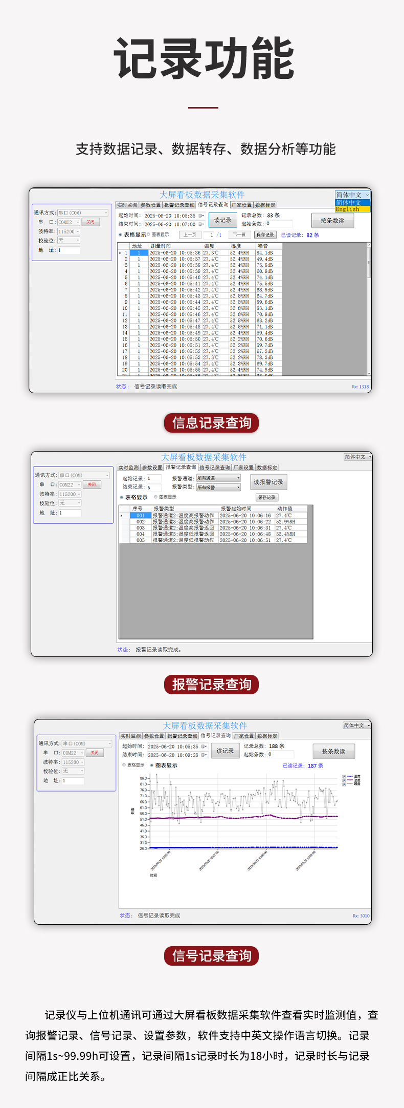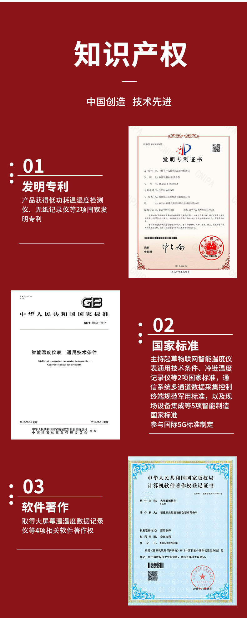 虹潤(rùn)公司是專(zhuān)業(yè)生產(chǎn)環(huán)境監(jiān)測(cè)儀表的國(guó)家專(zhuān)精特新“小巨人”企業(yè)。生產(chǎn)的大屏噪音溫濕度記錄儀,具有高清大屏顯示,數(shù)據(jù)記錄與轉(zhuǎn)存,同步觸發(fā)可靠預(yù)警,RS485或以太網(wǎng)通訊等特點(diǎn)。產(chǎn)品獲得一種手持式低功耗溫濕度檢測(cè)儀、無(wú)紙記錄儀等2項(xiàng)國(guó)家發(fā)明專(zhuān)利,主持起草物聯(lián)網(wǎng)智能溫度儀表通用技術(shù)條件、冷鏈溫度記錄儀等2項(xiàng)國(guó)家標(biāo)準(zhǔn),通信系統(tǒng)多通道數(shù)據(jù)采集控制終端規(guī)范軍用標(biāo)準(zhǔn),以及現(xiàn)場(chǎng)設(shè)備集成等5項(xiàng)智能制造國(guó)家標(biāo)準(zhǔn),參與國(guó)際5G標(biāo)準(zhǔn)制定,取得大屏幕溫濕度數(shù)據(jù)記錄儀等3項(xiàng)相關(guān)軟件著作權(quán)。產(chǎn)品廣泛應(yīng)用于電子制造、醫(yī)療科研、倉(cāng)儲(chǔ)管理、畜牧養(yǎng)殖、建筑工程等諸多領(lǐng)域。