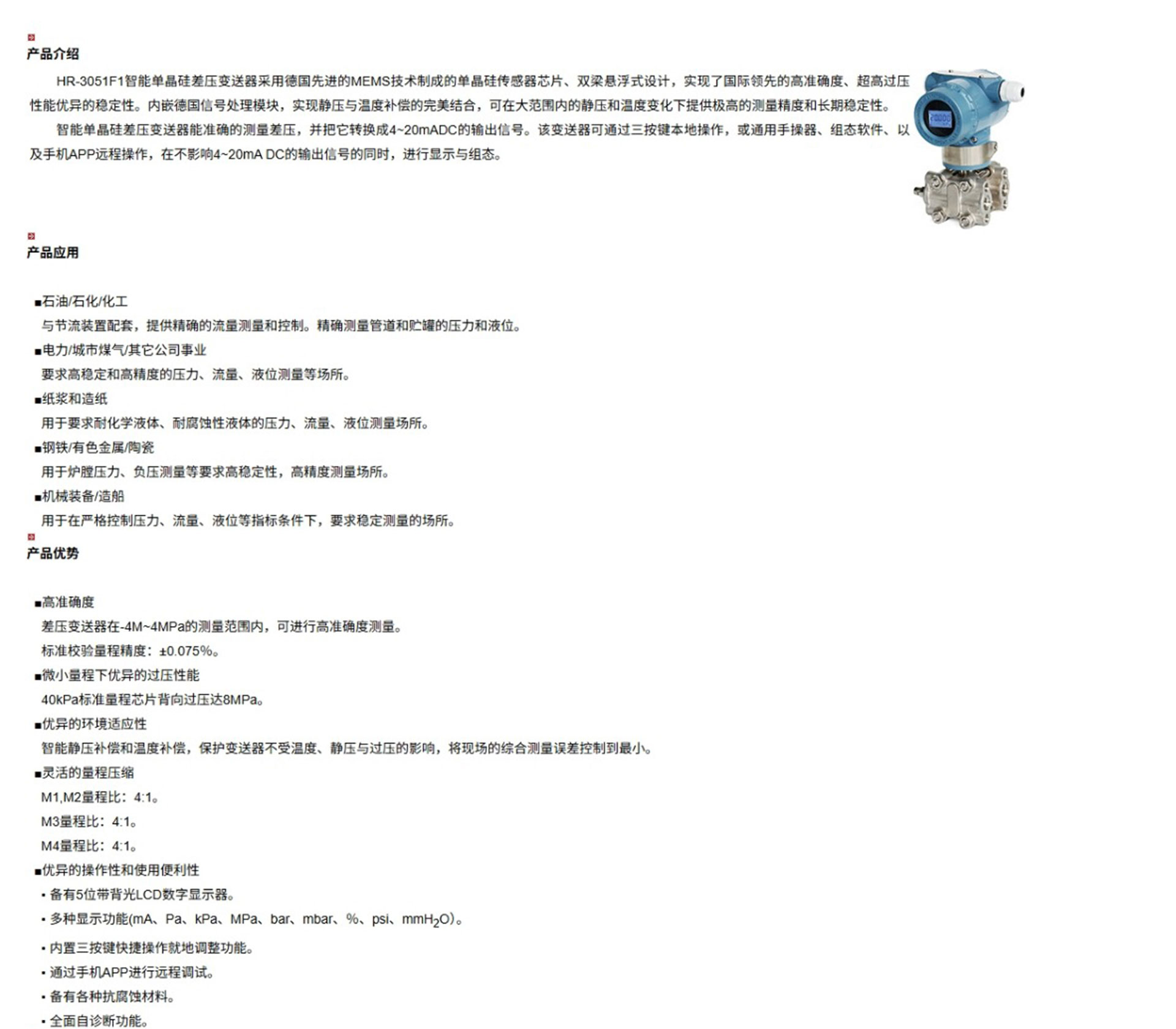 HR-3051F1智能單晶硅差壓變送器能準確的測量差壓,并把它轉(zhuǎn)換成4~20mADC的輸出信號。該變送器可通過三按鍵本地操作,或通用手操器、組態(tài)軟件、以及手機APP遠程操作,在不影響4~20mA DC的輸出信號的同時,進行顯示與組態(tài)。