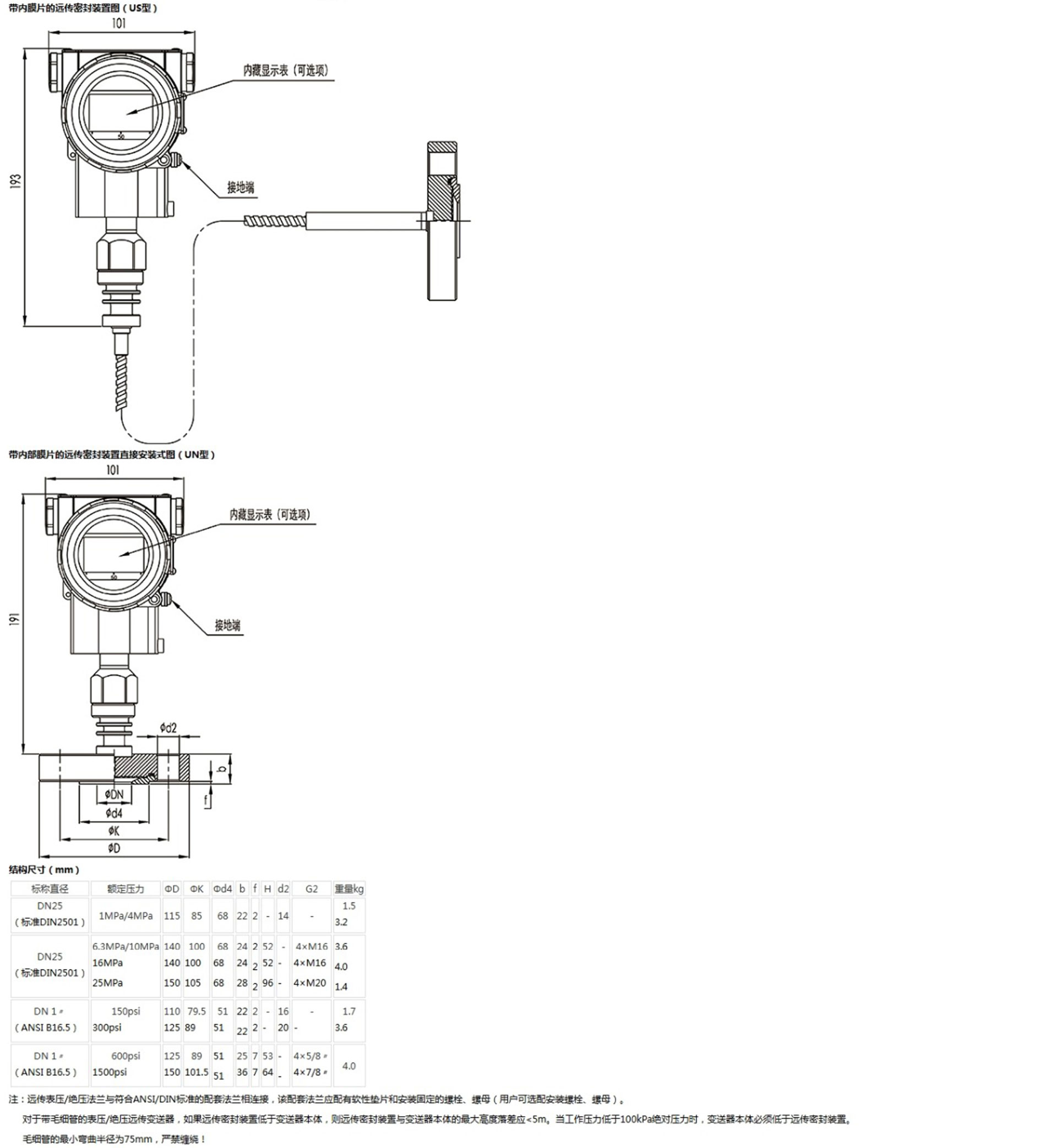 該產(chǎn)品用于測量液體、氣體或蒸汽的液位、密度、壓力,將其轉(zhuǎn)變成4~20mA (HART)電流輸出信號,可通過RST375手持終端對它們進(jìn)行參數(shù)設(shè)定、過程監(jiān)控等。測量范圍(未遷移時(shí))為0-6kPa~25MPa,液位法蘭的額定壓力分別為:1.6/4MPa、6.4MPa、10MPa、150psi、300psi或600psi。