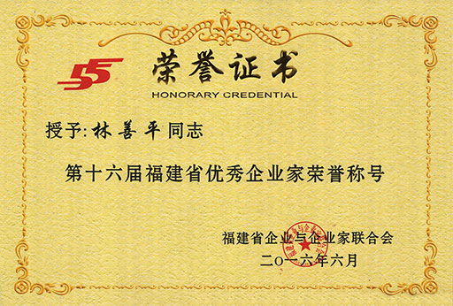 為弘揚(yáng)優(yōu)秀企業(yè)家深化改革、科學(xué)管理、與時(shí)俱進(jìn)、勇于創(chuàng)新的開(kāi)拓精神,激勵(lì)廣大企業(yè)家敢為天下先、愛(ài)拼才會(huì)贏的闖勁,為推動(dòng)福建省產(chǎn)業(yè)轉(zhuǎn)型升級(jí)和經(jīng)濟(jì)持續(xù)健康發(fā)展建功立業(yè),近日,福建省企業(yè)與企業(yè)家聯(lián)合會(huì)組織開(kāi)展了每?jī)赡暝u(píng)選一次的福建省優(yōu)秀企業(yè)家評(píng)選工作,并于2016年6月24日決定授予98位企業(yè)經(jīng)營(yíng)管理者“第十六屆福建省優(yōu)秀企業(yè)家”榮譽(yù)稱(chēng)號(hào),虹潤(rùn)公司董事長(zhǎng)林善平榮獲該榮譽(yù)稱(chēng)號(hào)。