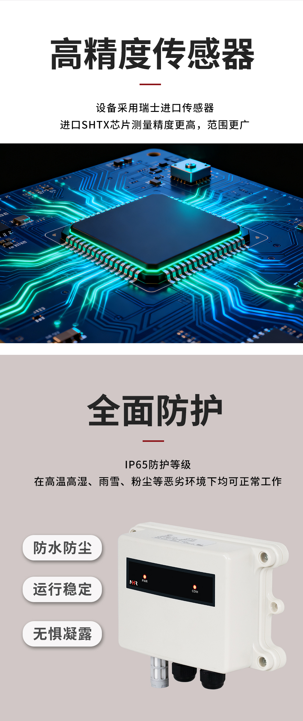 虹潤(rùn)公司是專業(yè)生產(chǎn)環(huán)境監(jiān)測(cè)儀表的國(guó)家專精特新“小巨人”企業(yè)。生產(chǎn)的一體式溫濕度變送器,具有溫度、濕度、露點(diǎn)高精準(zhǔn)的測(cè)量與變送,報(bào)警繼電器輸出,RS485/RS232通訊,IP65防護(hù)等級(jí)等特點(diǎn)。產(chǎn)品獲得一種手持式低功耗溫濕度檢測(cè)儀、大屏幕溫濕度記錄儀等2項(xiàng)國(guó)家發(fā)明專利,主持起草物聯(lián)網(wǎng)智能溫度儀表通用技術(shù)條件、冷鏈溫度記錄儀等2項(xiàng)國(guó)家標(biāo)準(zhǔn),以及通信系統(tǒng)多通道數(shù)據(jù)采集控制終端規(guī)范軍用標(biāo)準(zhǔn),以及現(xiàn)場(chǎng)設(shè)備集成等5項(xiàng)智能制造國(guó)家標(biāo)準(zhǔn),參與國(guó)際5G標(biāo)準(zhǔn)制定,取得溫濕度儀表等3項(xiàng)相關(guān)軟件著作權(quán)。產(chǎn)品廣泛應(yīng)用于工業(yè)現(xiàn)場(chǎng)、農(nóng)業(yè)大棚、倉(cāng)儲(chǔ)物流、地下管廊、養(yǎng)殖孵化、配電機(jī)房等諸多領(lǐng)域。