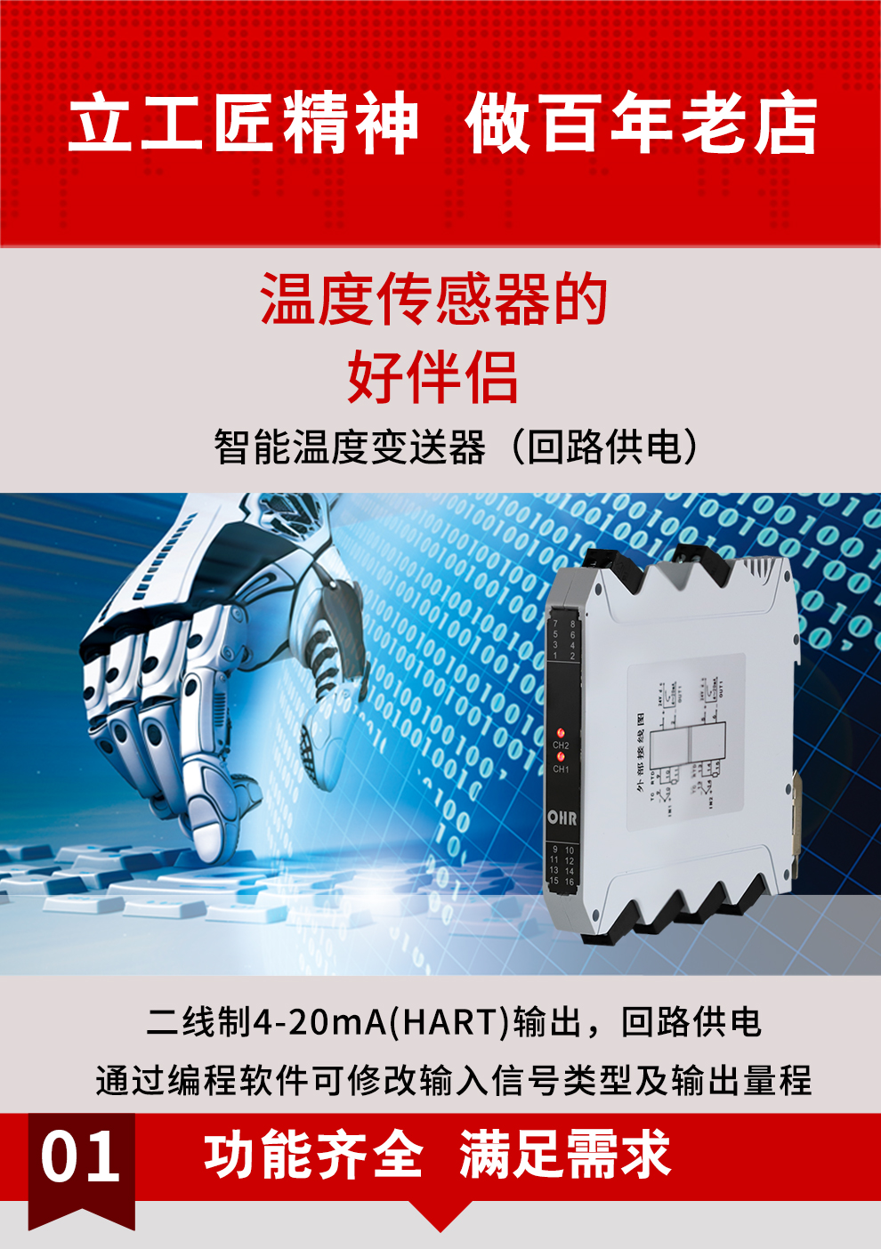 虹潤公司是專業(yè)生產(chǎn)溫度變送器的國家專精特新“小巨人”企業(yè)。生產(chǎn)的HART智能溫度變送器,具有適配各類溫度傳感器,通過編程線修改輸入信號(hào)類型及量程,二線制4-20Ma(HART)輸出,回路供電等特點(diǎn)。該產(chǎn)品不僅通過HART基金會(huì)認(rèn)證、德國萊茵 CE 認(rèn)證與 SIL 功能安全認(rèn)證,還獲得具備減震抗干擾能力的溫度變送器、信號(hào)隔離器、一種二端子模塊、無源信號(hào)隔離器等4項(xiàng)國家發(fā)明專利,主持起草物聯(lián)網(wǎng)智能溫度儀表、現(xiàn)場(chǎng)設(shè)備工具(FDT)接口規(guī)范、工業(yè)過程測(cè)量和控制系統(tǒng)用溫度變送器等3項(xiàng)國家標(biāo)準(zhǔn),以及通信系統(tǒng)多通道數(shù)據(jù)采集控制終端規(guī)范軍用標(biāo)準(zhǔn),參與國際5G標(biāo)準(zhǔn)制定,取得HART溫度變送器、智能溫度變送器等5項(xiàng)相關(guān)軟件著作權(quán)。產(chǎn)品廣泛應(yīng)用于石油、化工、電力、冶金、制藥、食品、水處理等各種工業(yè)領(lǐng)域。