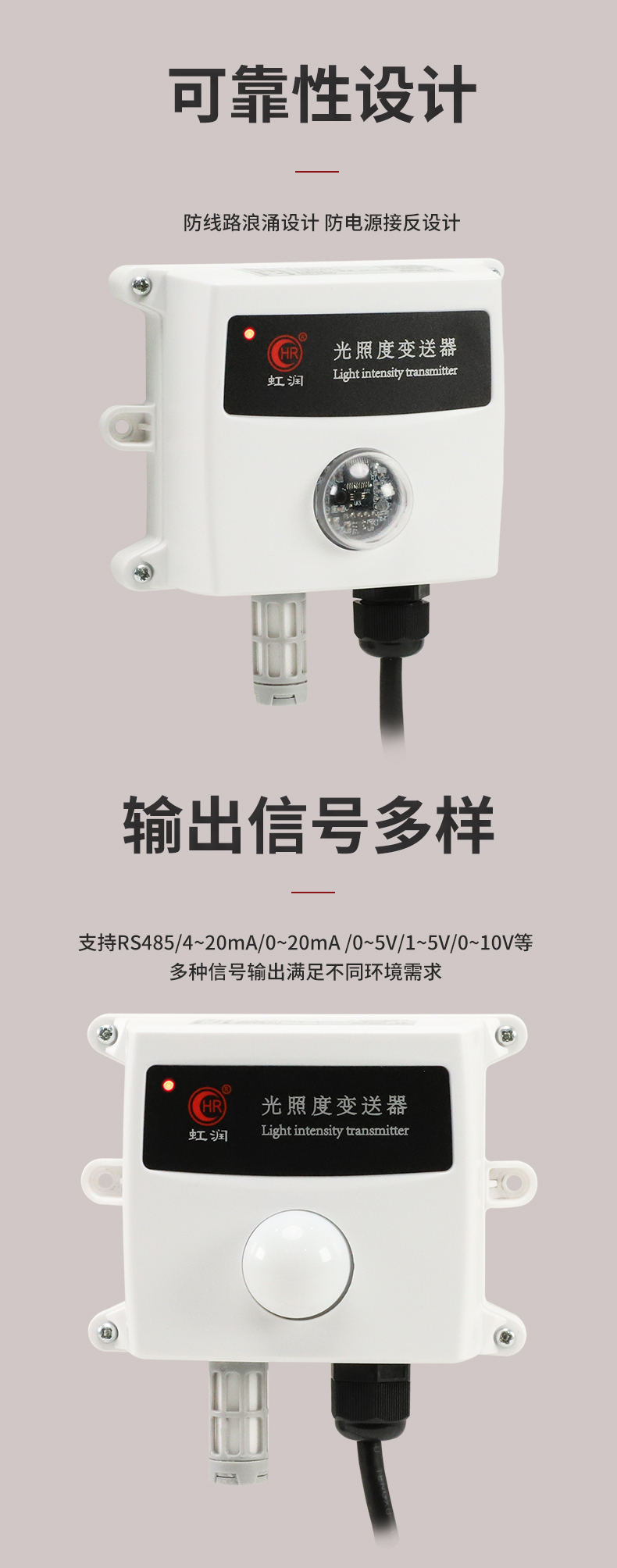 虹潤公司是專業(yè)生產(chǎn)環(huán)境監(jiān)測儀表的國家專精特新“小巨人”企業(yè)。生產(chǎn)的光照度變送器,具有高精度感光傳感器,響應(yīng)靈敏,準(zhǔn)確度高,低功耗,模擬量變送輸出或RS485通訊等特點。產(chǎn)品獲得一種農(nóng)業(yè)監(jiān)控變送器、一種儀表電源等2項實用新型專利,主持起草現(xiàn)場設(shè)備集成等5項智能制造國家標(biāo)準(zhǔn),以及現(xiàn)場設(shè)備工具(FDT)接口規(guī)范、物聯(lián)網(wǎng)總體技術(shù)智能傳感器特性與分類等2項國家標(biāo)準(zhǔn),參與國際5G標(biāo)準(zhǔn)制定,取得農(nóng)業(yè)監(jiān)測變送器等3項相關(guān)軟件著作權(quán)。產(chǎn)品廣泛應(yīng)用于溫室大棚、花卉養(yǎng)殖、科研實驗、智能樓宇、戶外照明等環(huán)境場合對光照度的檢測。