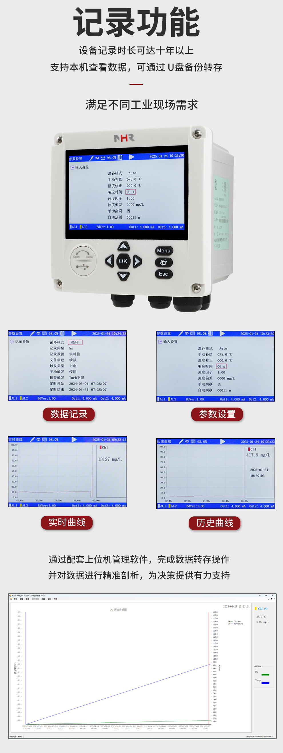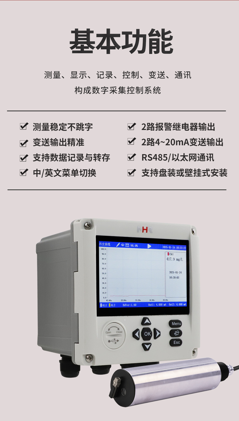 虹潤公司是專業(yè)生產(chǎn)水質分析儀的國家專精特新“小巨人”企業(yè)。生產(chǎn)的濁度/污泥記錄儀,具有彩色大屏顯示,測量精準穩(wěn)定不跳字,數(shù)據(jù)記錄與轉存,RS485/以太網(wǎng)通訊,配套上位機管理軟件等特點。產(chǎn)品獲得一種平板無紙記錄儀、智能化控制器等2項國家發(fā)明專利;主持起草物聯(lián)網(wǎng)智能記錄儀表通用技術條件、現(xiàn)場設備工具(FDT)接口規(guī)范.、過程分析技術系統(tǒng)等3項國家標準,以及通信系統(tǒng)多通道數(shù)據(jù)采集控制終端規(guī)范軍用標準,參與國際5G標準制定;取得濁度、污泥濃度無紙記錄儀等3項相關軟件著作權。產(chǎn)品廣泛應用于市政供水、污水處理、食品、制藥、造紙、石化、冶金、水處養(yǎng)殖等諸多領域。