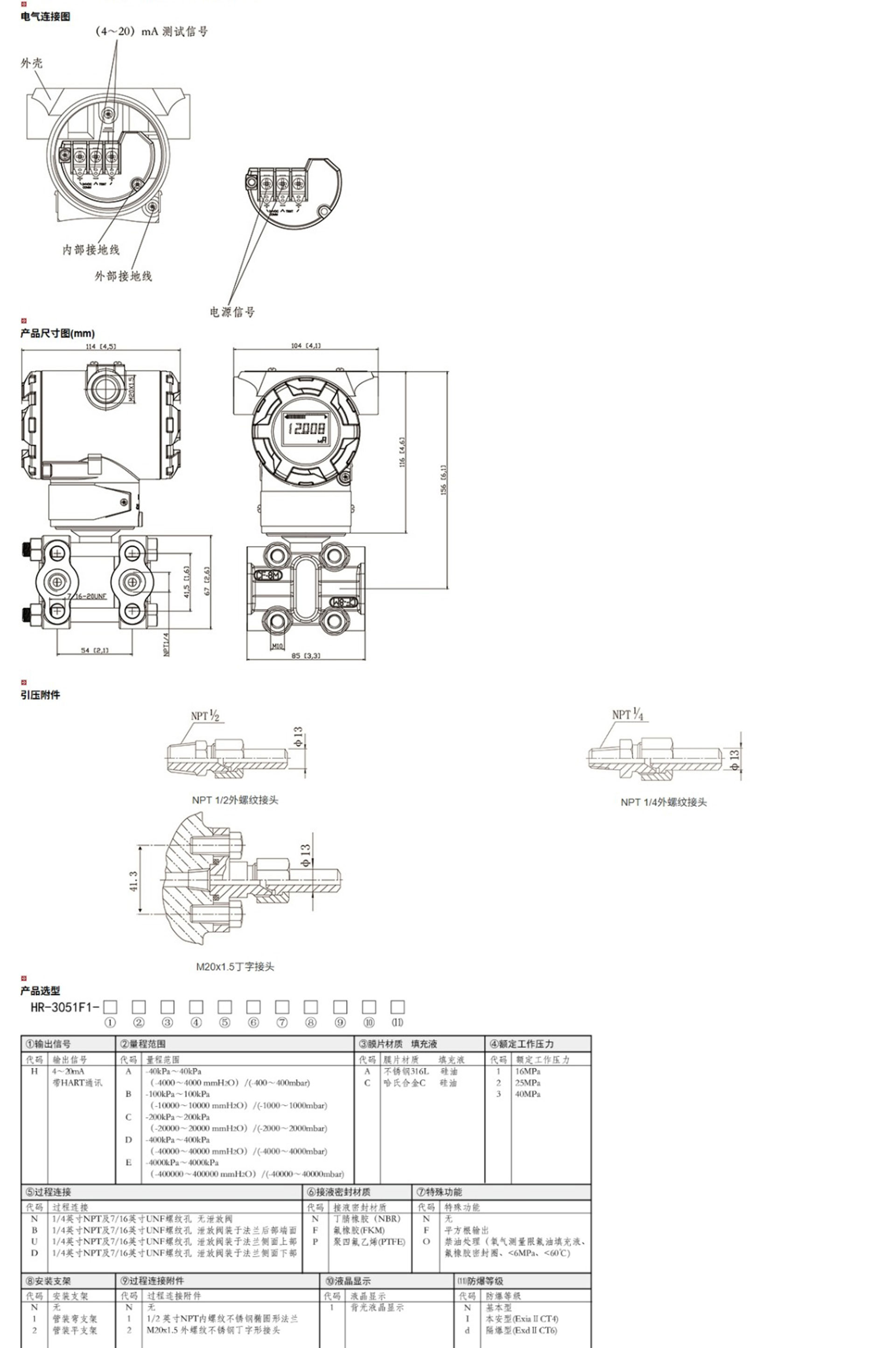 HR-3051F1智能單晶硅差壓變送器能準確的測量差壓,并把它轉(zhuǎn)換成4~20mADC的輸出信號。該變送器可通過三按鍵本地操作,或通用手操器、組態(tài)軟件、以及手機APP遠程操作,在不影響4~20mA DC的輸出信號的同時,進行顯示與組態(tài)。
