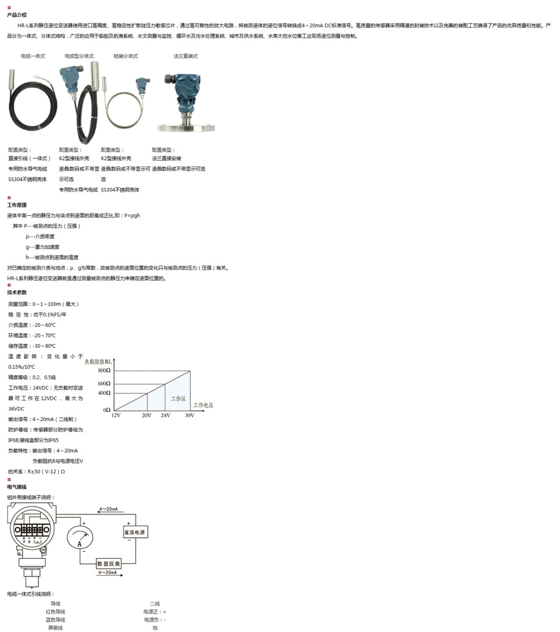 HR-L系列靜壓液位變送器使用進口高精度、高穩(wěn)定性擴散硅壓力敏感芯片,通過高可靠性的放大電路,將被測液體的液位信號轉(zhuǎn)換成4~20mA DC標(biāo)準(zhǔn)信號。
